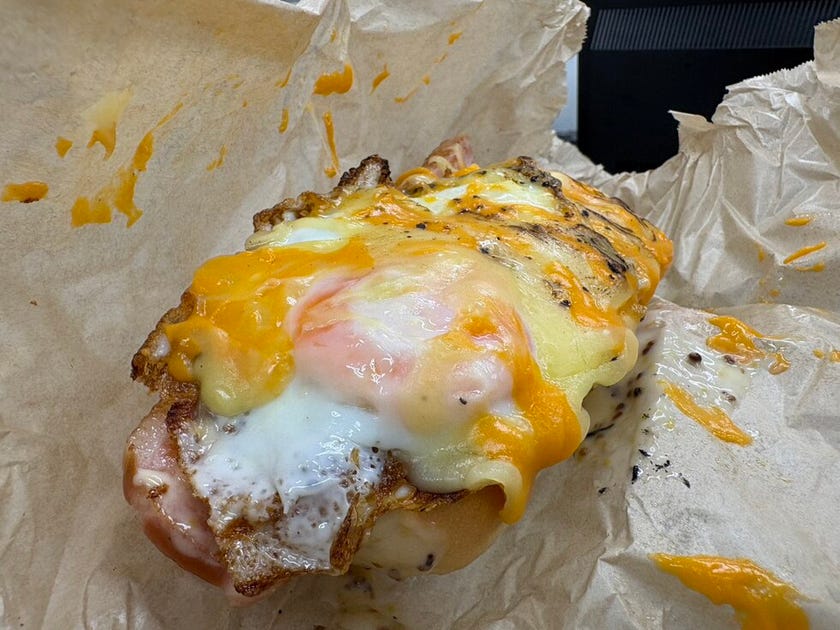 ロングなソーセージ、分厚いベーコン、目玉焼き2枚、チーズ2種類、粒マスタードソース
